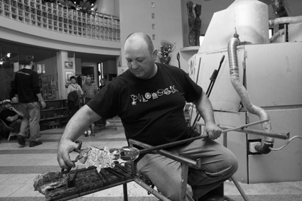V současné době asi budete marně hledat sklářského mistra, jakým je právě Jiří Pačinek. Tento talentovaný umělecký sklář svými díly uchvacuje nejednoho milovníka sklářského umění. Svou sklářskou kariéru započal již v roce 1990, kdy nastoupil do sklárny Chřibská 1414. Poté následovala dlouholetá praxe ve sklárně Ajeto, kde svůj talent rozvíjel na dílech pro takové osobnosti světového umění a designu jakými jsou Bořek Šípek, René Roubíček, Leon Applebaum, Louis Sakalovski a mnozí další. Nezapomínal však ani na své návrhy, které realizoval ve svém volném čase. Sklárna Ajeto mu poskytla jedinečné místo pro vyprofilování osobitého stylu tvorby a práce, který nakonec uplatnil ve své vlastní sklárně, kterou postavil v roce 2007. Zde využil svého potenciálu a začal vytvářet velkorozměrové, technicky náročné dekorativní plastiky spolu s čistě užitkovými skleněnými objekty, jako jsou vázy, mísy a další předměty. V průběhu krátkého působení ve vlastní sklárně se staly jeho díla součástí soukromých uměleckých sbírek, kolekcí designových firem a galerií. Tyto a mnohé další skleněné skvosty máte nyní možnost vidět a zakoupit v nové Galerii v Novém Boru v historické budově na třídě T. G. Masaryka. Součástí Galerie je i expozice „Přátelé skla“, kde budou představovat svá díla jiní sklářští autoři.