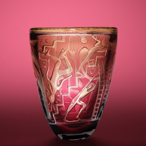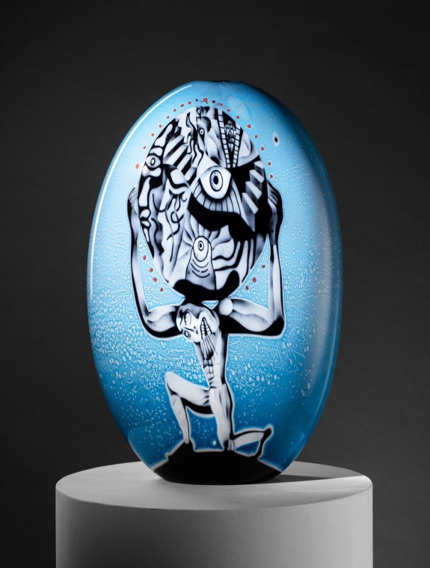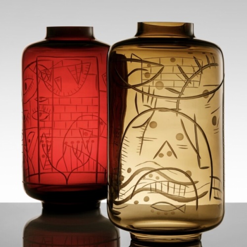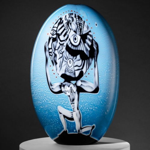 Hermansson works in a Swedish narrative glass tradition, and with his background in graffiti, he brings a graphically expressive style into glass. In the last 15 years, he has focused on, and developed two Swedish glass techniques, Graal and Ariel. These techniques make it possible to transfer illustrations into the glass mass and tell stories in the glass. Storytelling is a central part of Hermansson's work, and is also closely linked to a very advanced craft.